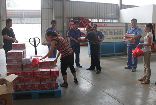 烈日炎炎,持續(xù)高溫,集團(tuán)領(lǐng)導(dǎo)時刻牽掛著一線員工的生產(chǎn)、生活情況。8月15日,氣溫高達(dá)36℃,受集團(tuán)總裁李丹委托,公司黨委書記、工會主席張菊林,公司黨委副書記、辦公室主任朱雅娟,公司工會委員張琴等帶領(lǐng)有關(guān)人員,深入各制造公司車間,開展高溫送清涼活動,給堅守工作崗位的一線員工送去冰紅茶、毛巾、香皂等防暑用品。